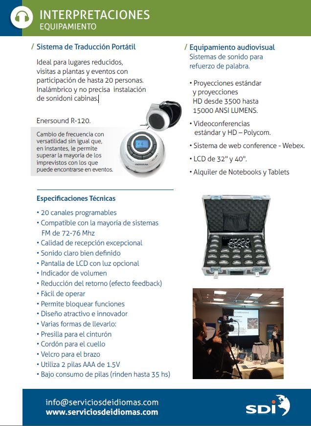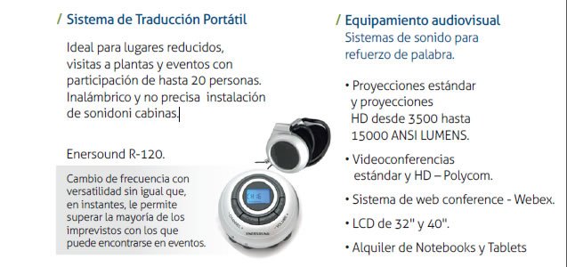 Nuestros servicios de interpretación consecutiva y simultánea vienen acompañados con toda la organización de los equipos requeridos para dichos eventos. Nuestros intérpretes cuentan con experiencia en las principales empresas multinacionales de la Argentina. Contamos con profesionales de vasta experiencia en el entrenamiento de personal cuyo mayor objetivo es dar respuesta a los desafíos del mercado actual. Para lograrlo utilizamos una metodología de trabajo según las necesidades de cada uno de nuestros clientes. Alquiler de equipamiento audiovisual para su eventos.